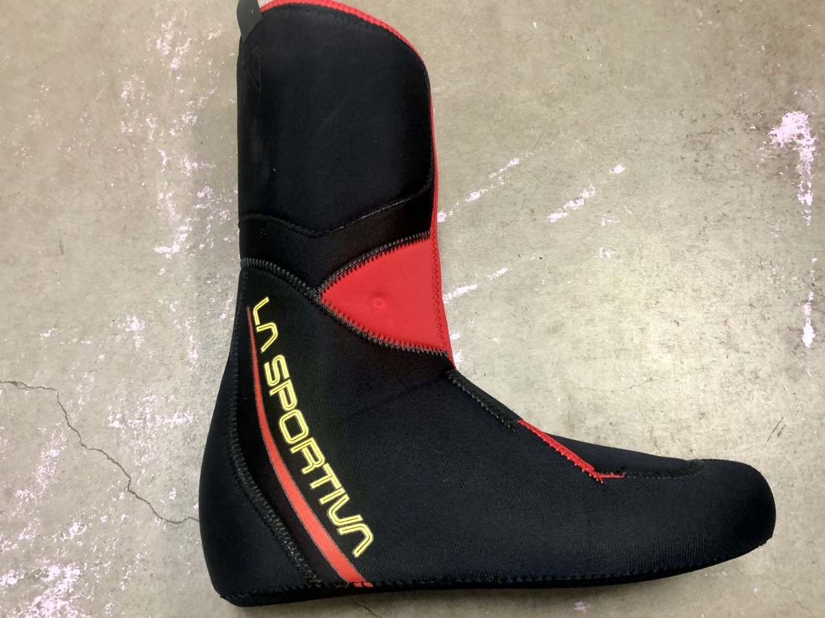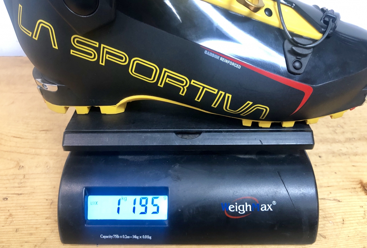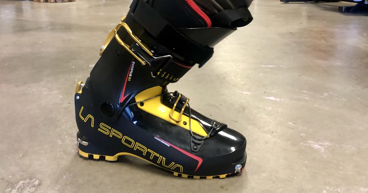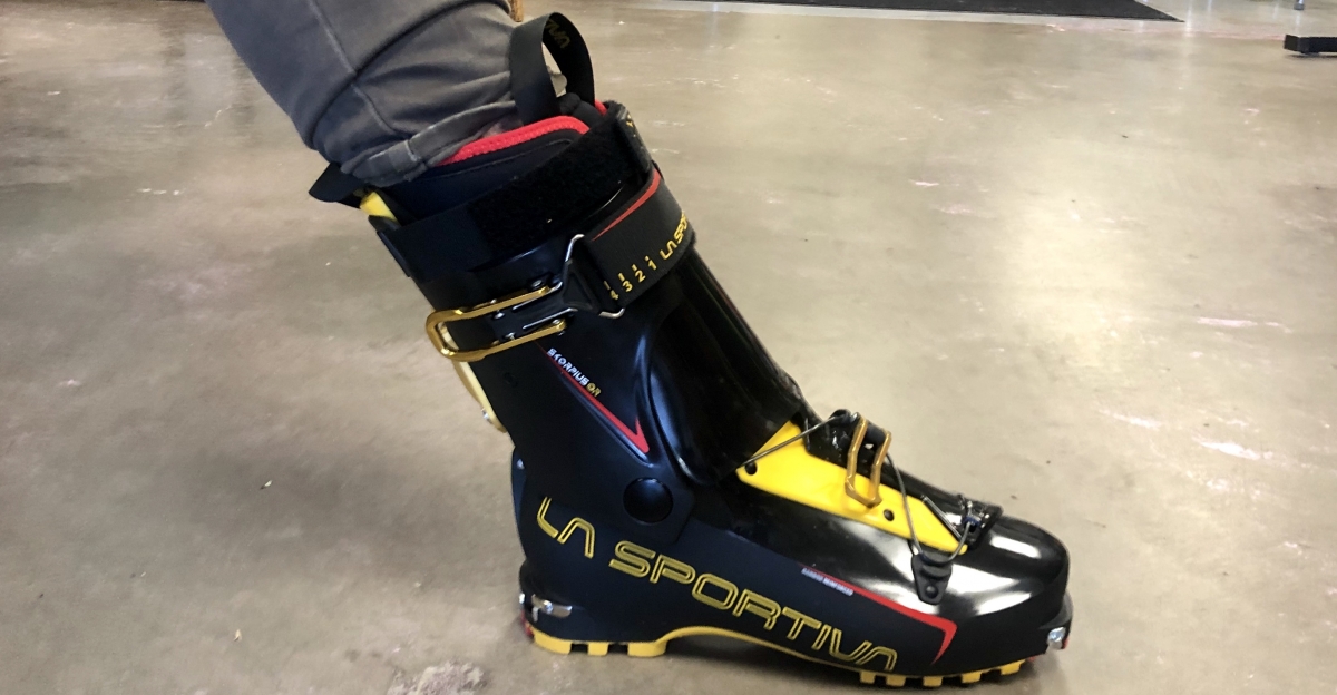 Potentials of good and evil aside, the claimed 1000 g (though we weighed as 1185 g) Grilamid/carbon constructed boot could in fact transform the average ski tourer into a randonee racing machine. Or just a more efficient ski tourer. That is, after all, part of the boot’s intent. La Sportiva calls the Skorpius CR “a lightweight touring boot for general backcountry skiing” that’s also suitable for the dabbler in randonee races. The boot shares the same shape and geometry as Sportiva’s 2018 Solar (Stellar for women) with the upgrade of carbon reinforced cuff and shell. With a 68 degree range of motion, it’s clearly oriented to efficiency uphill, but gets an upgrade in stiffness (rated 100 vs. 90 for the Solar) to accommodate heavier, more aggressive skiers on the down.