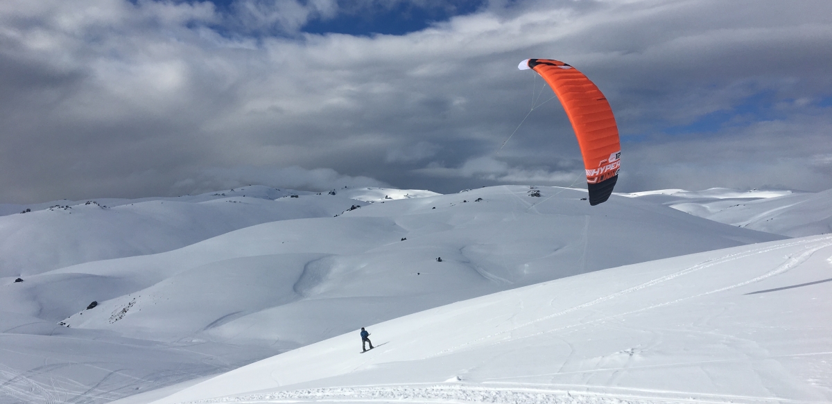 In the carpark of the Snow Farm, on the slopes of the Pisa Range in southern New Zealand, I used to see them coming back – tired, cold and wind-burnt but buzzing with excitement and wide-eyed with wonder. The snow kiters! On skis or snowboards, tethered to colourful kites, they would sail off into the arctic landscapes of Mt Pisa and return with tales of covering 50 or more miles of remote backcountry in just a couple of hours, and acres upon acres of untracked powder worth several days of heli-skiing which they had all to themselves. But for me, the final jolt of inspiration came from the documentary film Mountains of the Wind, an informal history of snow kiting, in the words of Noah Poritz, one of the sport’s pioneers.