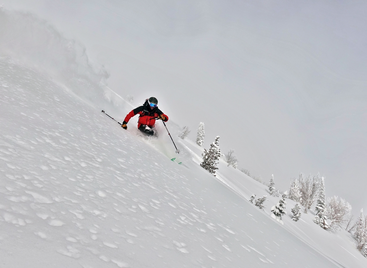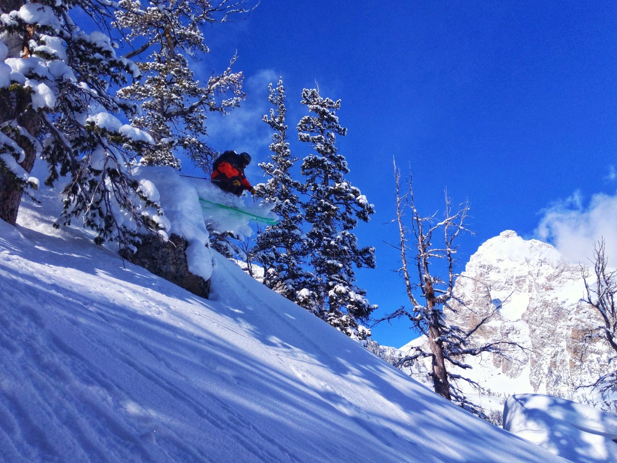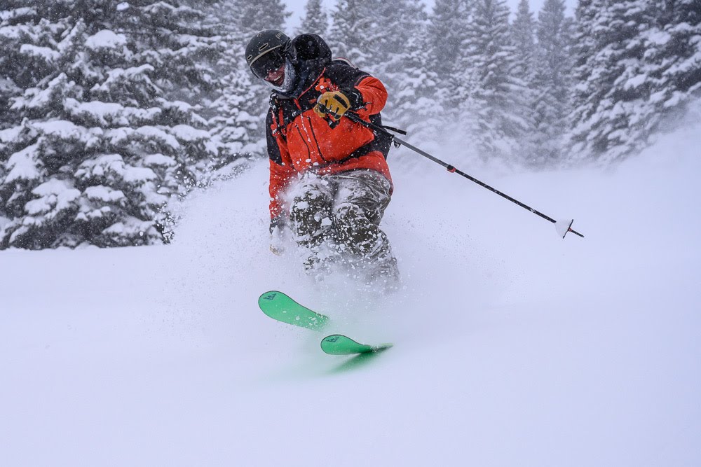 Day two: touring in Teton National Park and up Shadow Mountain. Just over 3,000 ft of climbing to the top and several inches of new snow, lighter and loftier than the day before. We linked up pillow features and open shots through the old growth White Pines, tree spacing a Colorado skier can only dream of. The stiffness of these skis are confidence inspiring when launching off features, the traditional camber underfoot allows for snappy, smooth turns through the trees.
