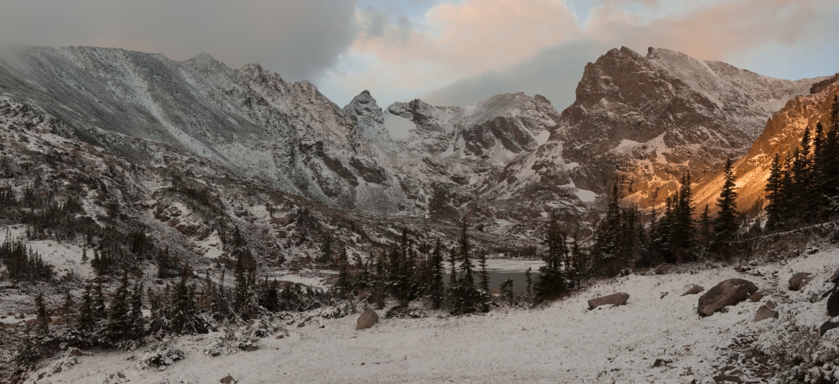 A cold September storm prompted us to drop our weekend plans and make a trip to the high country of the Indian Peaks. Driving through a dense fog and misty rain in Boulder Canyon, we emerged at the Brainard Lake Trailhead with a dusting of fresh snow. With the promise of more awaiting us up high, we set out through wet boulder-fields to chase fresh turns on Apache Peak.