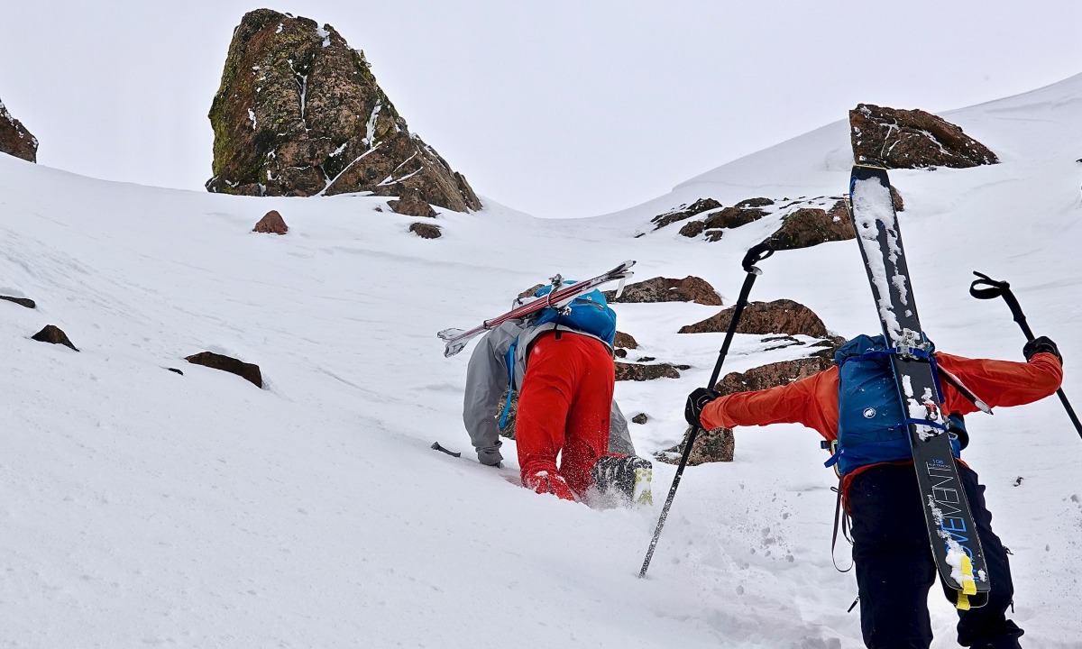 Moving quickly in thin shell pieces without mid layers last spring. Doug sets the punchy faceted boot pack last spring in FutureLight LT while Chris opts for a thin Arcteryx climbing softshell top and mid weight bottom.