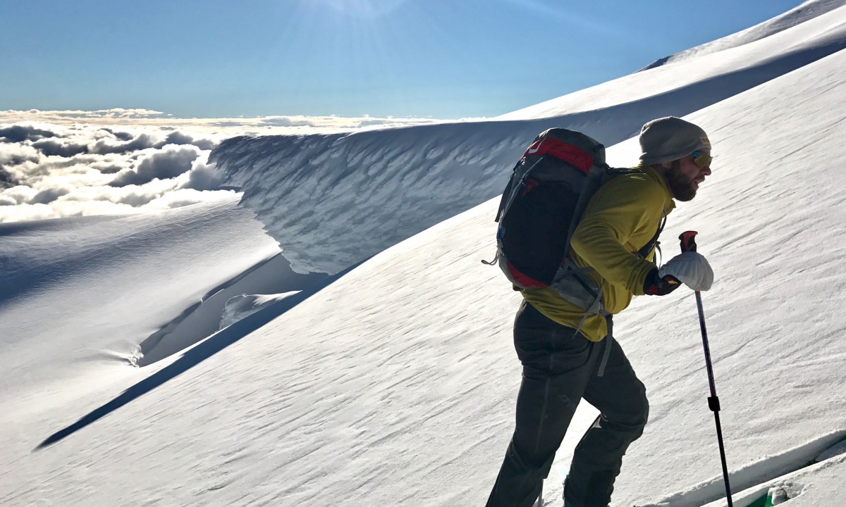 I go with a two part base layer system for top and bottom, an ultralight poly running T-shirt (Dynafit Traverse is my favorite) and poly boxer brief next to skin almost every day. North Face’s L2 Powergrid hoodie goes over the T in the winter months, Outdoor Research’s Echo sun hoodie during springtime. I remove the T shirt from underneath the sun hoodie on the warmest of spring days. For fast paced tours or warm days, try ditching the long johns altogether or swapping for thin running shorts over synthetic underwear. When wanting a bit more warmth on the legs, the Helly Hansen Lifa Merino pant is a great 2 for 1; synthetic Lifa technology next to skin layered with Merino for warmth retention.