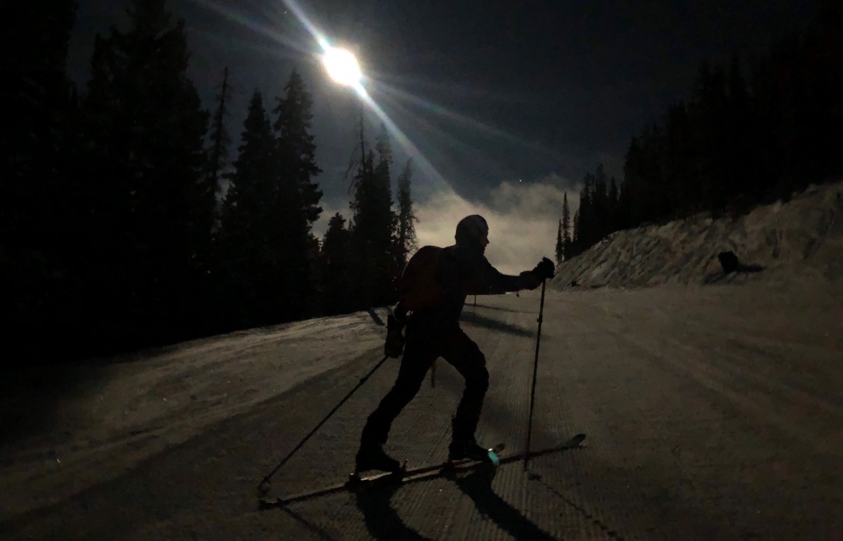 Extreme ski mountaineering was not on the menu for our full moon test, but damn if the skis weren’t fun for what we did ask of them. Doug and I skinned up Beaver Creek ski area and chose a slightly more adventurous descent route — that is, neither of us knew exactly where we were going. On our unintended route, we tried the skis in five inches of feathery pow on crust, dense trees, and soft bumps with an icy finish. True to form, the 74mm underfoot skis felt similarly stiff and springy to the 65mm underfoot race sticks I spend much of my training days on, but I found myself confidently opening them up more than I do on the race skis, despite the 172 length (long for me, as I’m typically in the 165cm range and less for skinny skis).