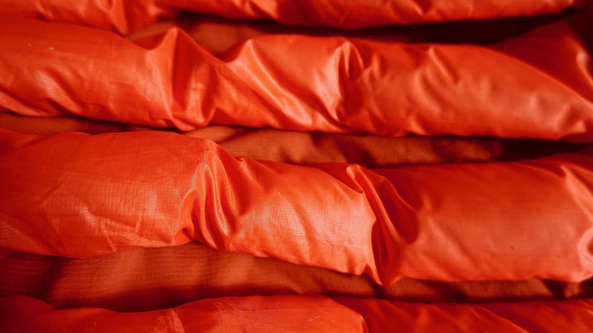 The 50/50 is so named for the equal distribution of down and a polyester nylon blend. Permeability is illustrated by the light filtering between the tubes.