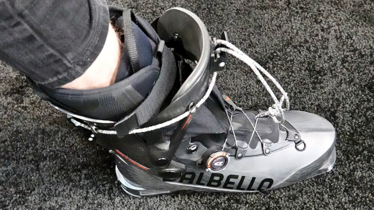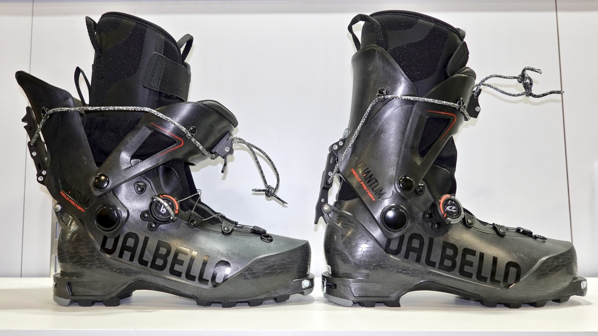 The Quantum utilizes the same plastics as many ultralight touring boots do these days — carbon infused grilamid — only even stiffer I’m told, and a harder durometer. So much so that the lower has to be made in halves and then heated and chemically bonded together, otherwise it can’t be removed from the mold. The lower cinches on the foot using Dalbello’s BOA-esque system, reminiscent of the Fischer Carbon Traverse’s lower closure. The dial on the foot ratchets not only in the righty-tighty direction but loose as well, allowing for fine adjustments for uphilling. The cable is not metal, but very thin woven dyneema rope.