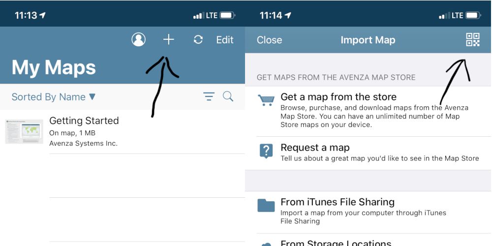 Once you export your map, CalTopo generates a QR code that you can then use to import to Avenza. When you are in the ‘My Maps’ tab of Avenza click the ‘+’ arrow in the upper right hand corner, click the QR code icon and then you can scan the QR code to upload your map. Once you have the map uploaded, you can track your location in real-time in the field.