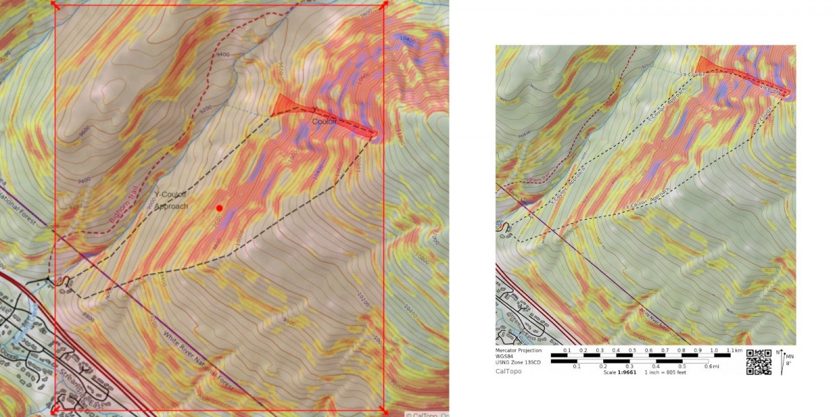 Map Definition: when you scroll an area on CalTopo, the app gives you the ability to zoom on different features with much higher clarity. Instead of zooming in to see the pixelated slope angle shading, the CalTopo app will recalibrate topo lines as you focus on a smaller terrain feature.