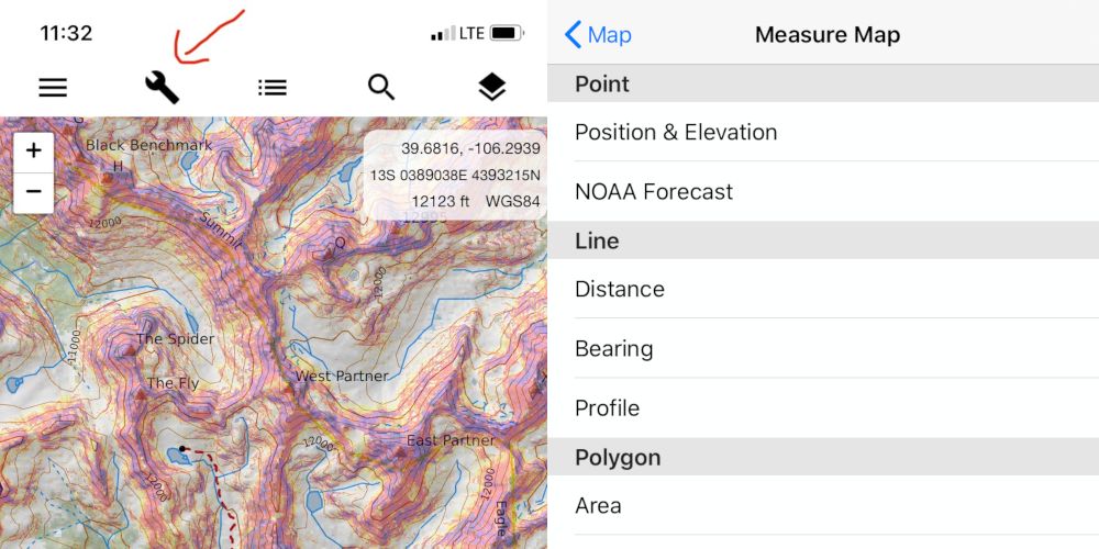 Offline Features: With the CalTopo App, you can draw polygons, lines and drop way points along your tour. You can also get information about those annotations. One of the most common times I use this feature in the field is when calculating the remaining distance and elevation of a climb. I will draw a line from where I am to where I want to go, and then I can learn about the route’s elevation gain, slope angle and overall distance. These features are in addition to the route tracking, elevation and compass features you can find on the Avenza App. Long story short, the CalTopo app gives you access to incredible information regardless of cell service.
