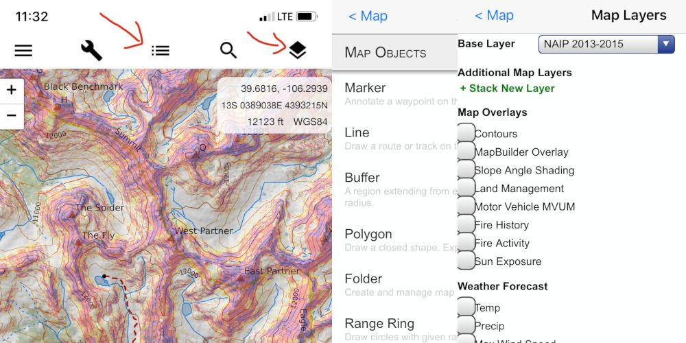 When you log into the CalTopo app, the interface will feel very familiar. In the upper right hand corner, the map displays the GPS coordinates and elevation just like on the website. Directly above that, the ‘layer’ icon gives you access to the same powerful features as the website. You can choose your base map, overlay wind plots or slope angle shading and even look at real time data from various weather and SNOTEL stations. Additionally, the app also allows you to annotate your map right from your phone. The bottom line is that the CalTopo App gives you virtually all of the same capabilities as the website, in a user friendly and familiar interface.