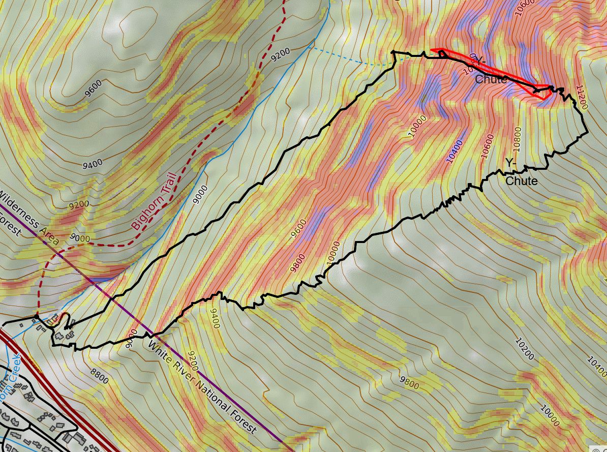 It’s no secret that heuristics play a role in our decision making in the field. For this reason, I try my best to make decisions about which terrain to open or close before I even leave my house. CalTopo has proved to be an invaluable tool for this application (see Aiden Goldie’s WildSnow article on how to use CalTopo’s features). When I come up with my trip plan for the day, I use CalTopo to draw polygons around the terrain I am comfortable (or not) traveling through. This way, when I am in the field, I can keep my little dot inside those polygons throughout my tour. This has helped me align my in-field decision making with the less heuristically influenced tour plan I built at home.