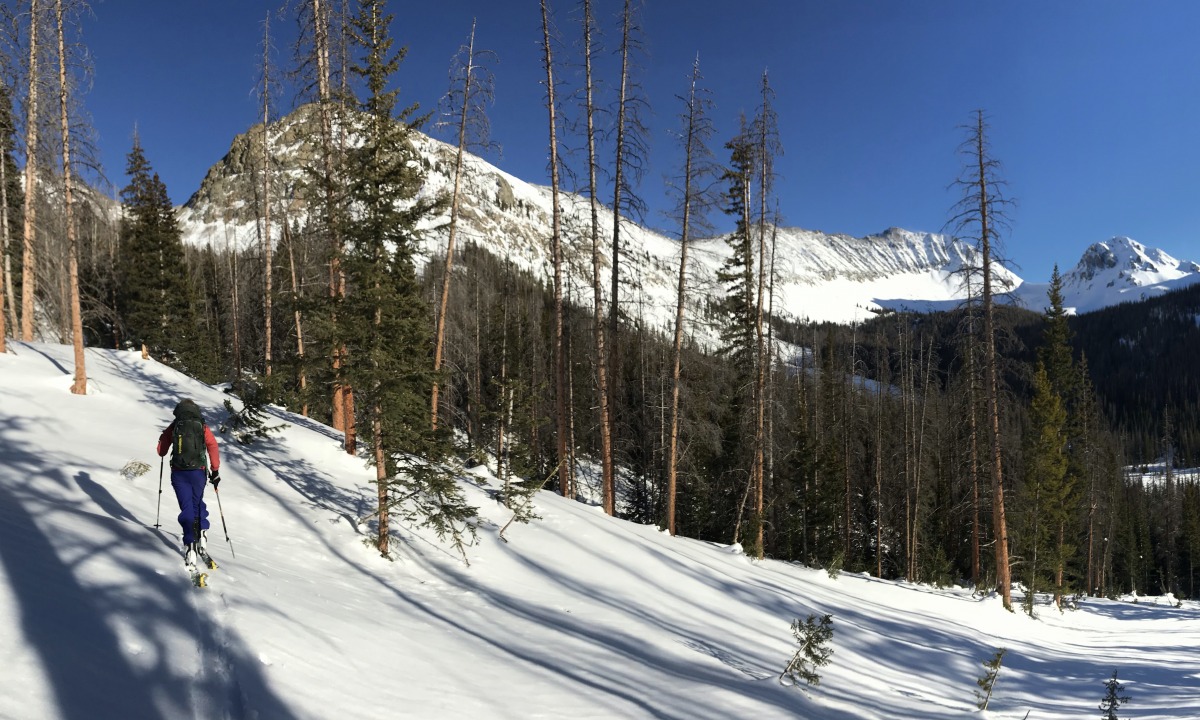 Roughly three miles of skinning brought us to our first saddle at 11,000 feet, just east of Seven Utes Mountain. The afternoon was cloudless with temps in the mid forties. We remarked on how soft and poppy the snow looked in north-facing trees but opted to forego our best chance of powder skiing for the day and dropped instead into the sun-crusted south facing slopes off the saddle. Using the Gaia GPS track we’d outlined the night before as a guide, we descended 900 feet to the meadow and transitioned.