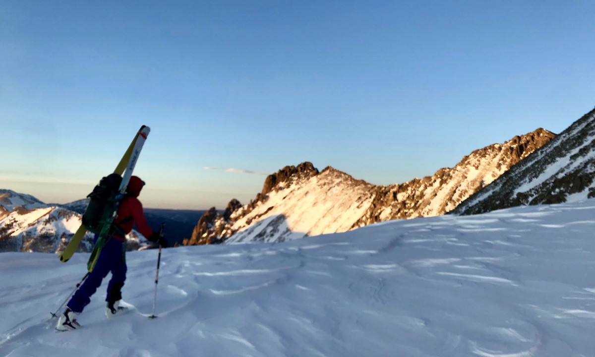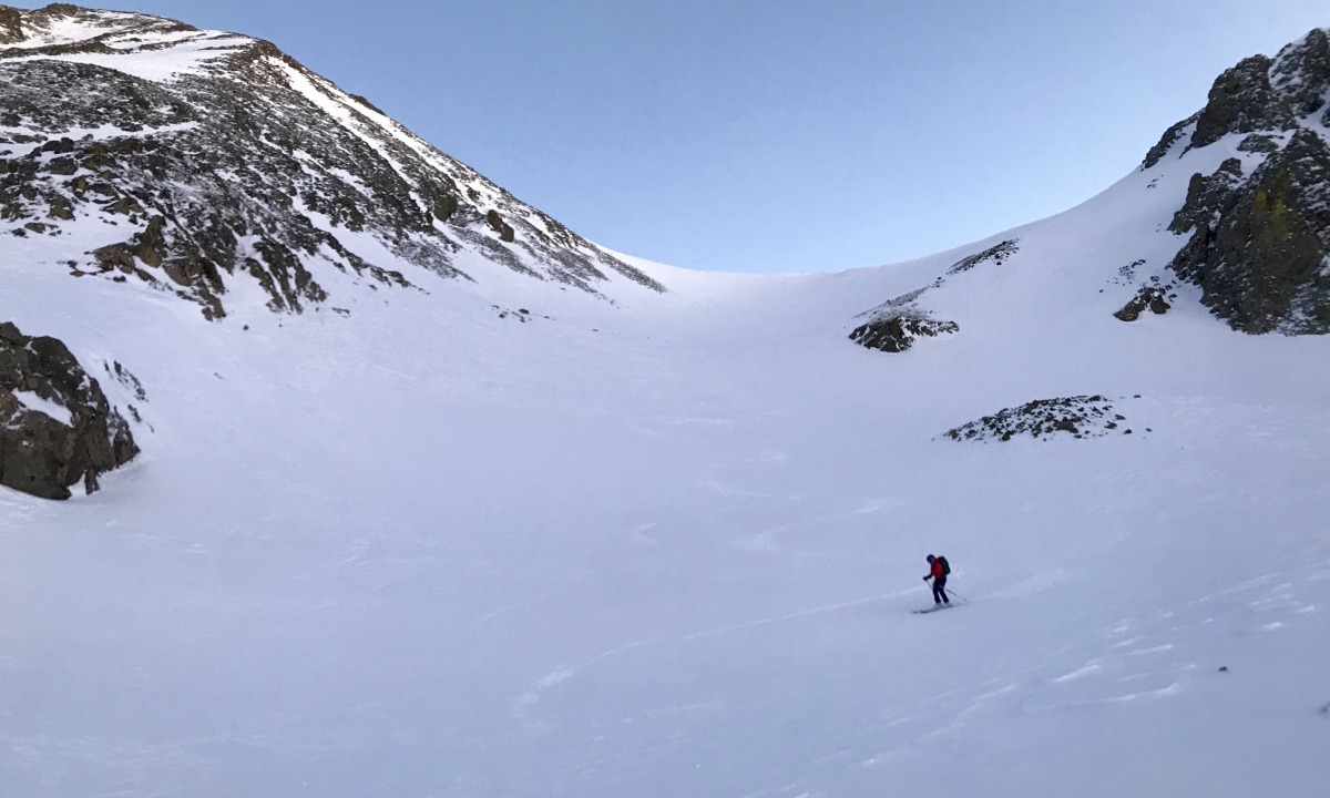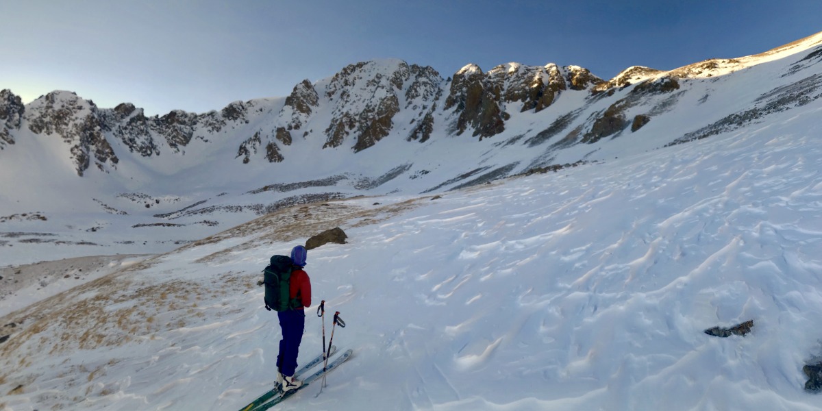 Finally the true saddle came into view. Evening light settled on the snow caps around us, splashing them gold. The coyote tracks had wandered elsewhere. We skinned up a wide, mellow bowl framed by 12,493 ft Mount Mahler and 12,945 ft Mount Richthofen. Steep couloirs began to reveal themselves in nearby ridgelines. The wind picked up, gusting against our backs as we started up a headwall. Skins and skis slipped on sastrugi. We switched to booting. I spotted dark brown pebbles — big horn sheep poop. We remarked on their hardiness to wander so high in winter.