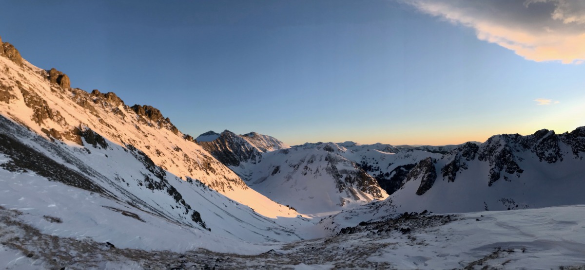 The snow gave way to icy tundra grass and in short time we stood atop the saddle, just over 12,000ft. The chunky summit of Mount Mahler loomed impressive and imposing beside our perch. The peaks behind us glowed hot pink and gold. We gazed down at the frozen Lake Agnes due north, at the hard, wind packed cirque we’d ski to get to it. The skiing was better than expected. Smooth and fast. We met a series of rocky benches and short chutes which led us to the lake, solid as concrete. We skated and scooched across to where it drained into a half pipe between scree and summer trail that spit us out into a summer parking lot beside the historic Lake Agnes cabin.