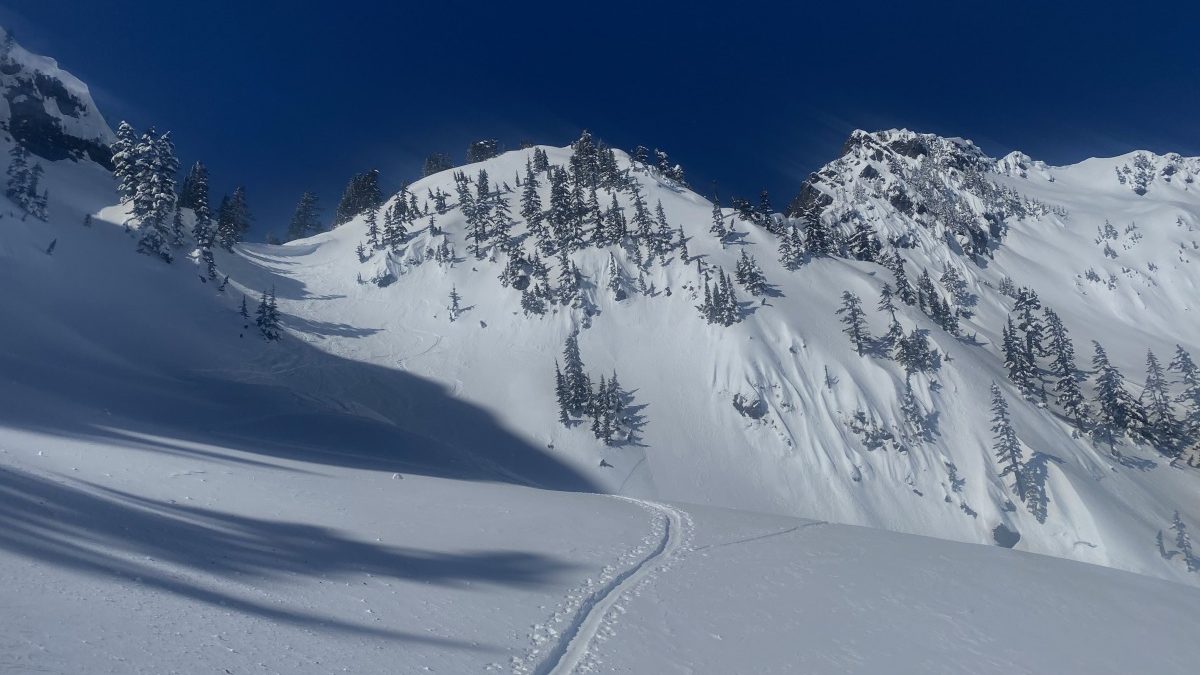 From Melakwa Pass we skied down to Chair Peak Lake and decided it wasn’t too late to add a little detour to our adventure. From the lake, a skin track and bootpack led us to the top of Roosevelt to ski Holy Diver Couloir. We commented on how well the bootback up Roosevelt was set and later found that one of our friends was the one to set it earlier that morning — small world! The ascent was quite steep, so safe avalanche conditions were key for this part. In case of harder surfaces, you may want pointy things with you. Holy Diver itself is wide and not particularly steep. The entrance is the narrowest part, but allowed for easy turning. We were the last party to ski it that day, and to our surprise that made for the best conditions. All the breakable crust was scraped away by the previous parties which made skiing in the couloir genuinely enjoyable.