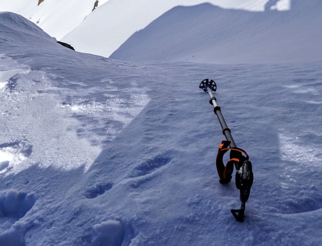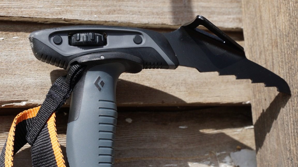 Before we get to that, though, let’s dissect this tool. The pole with pick weighs in just under a full pound. The pick alone weighs 5.3 oz, 150 grams. Though this is pretty hefty for a pole, I can understand what and why BD did not want to compromise in designing a life-saving tool like this. The FlickLock is the same as on all BD adjustable poles, by now a gold standard for pole connection. One nice little addition is the aluminum collar-like ring found about eight inches down the shaft. This ring is intended to be a grip support when climbing steeper slopes. I have always used some sort of grip support in this spot on my poles. I have a trusty pair G3 poles which have a similar ring made from soft plastic, and any other pole I’ve used has a stout ring of duct tape in that place.