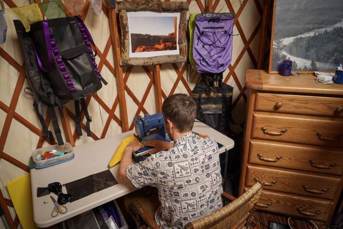 Gavin sewing together a fully custom Apocalypse Equipment SAC (Skiing And Climbing) in his yurt, on a ranch, in Jackson Wyoming, after a day of powder skiing / product testing, with the wood stove burning. Photo: Morgan Mcglashon