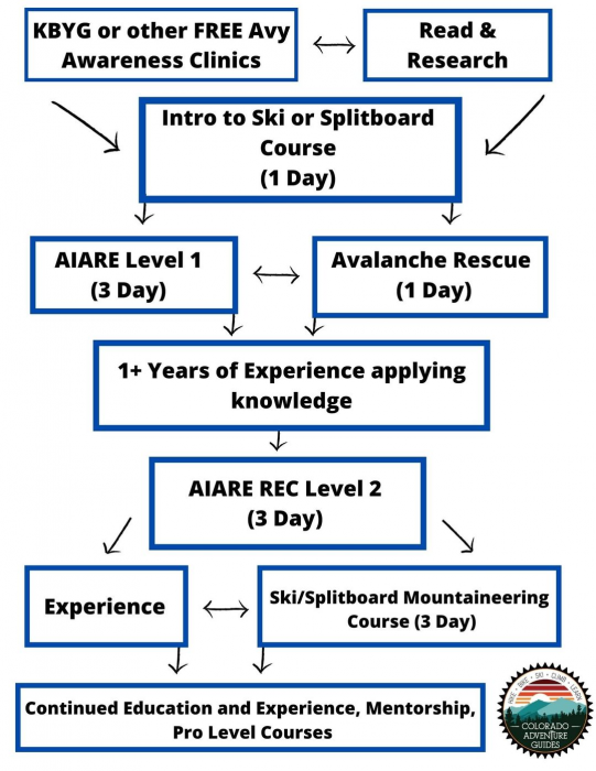 Breckenridge-based Colorado Mountain Guides put together the following flowchart to offer an ideal sequence of events for the budding backcountry skier. Note that the formal Level 1 avalanche course doesn’t take place until three other steps occur, including free courses, self education, and an introduction to using your gear.