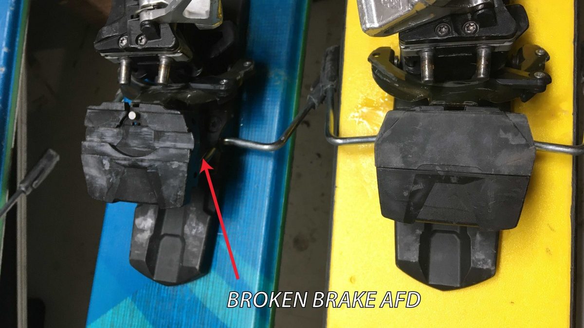 Broken/missing brake AFD. This isn’t a critical failure, and these bindings are still in daily use. However, the missing AFD could compromise the release of the binding, so it’d be best to replace the brakes.