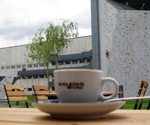 Sipping our tenth espresso of the day, we 'relax' at the employee coffee shop and watch the wall. This is how they climb the corporate ladder at Salewa. Not unlike some of the other outdoor companies around the world where how you climb is as important as how well you rock a spreadsheet.
