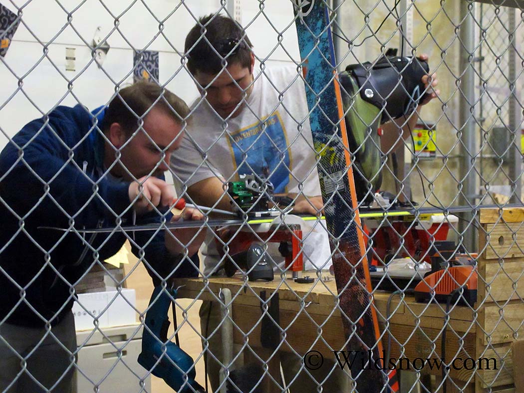 Wait a second there really is a BEAST. Dynafit Beast 16, that is, custom mounted on a Volkl V-Werks for a French customer waiting patiently in full ski gear on the other side of the window.