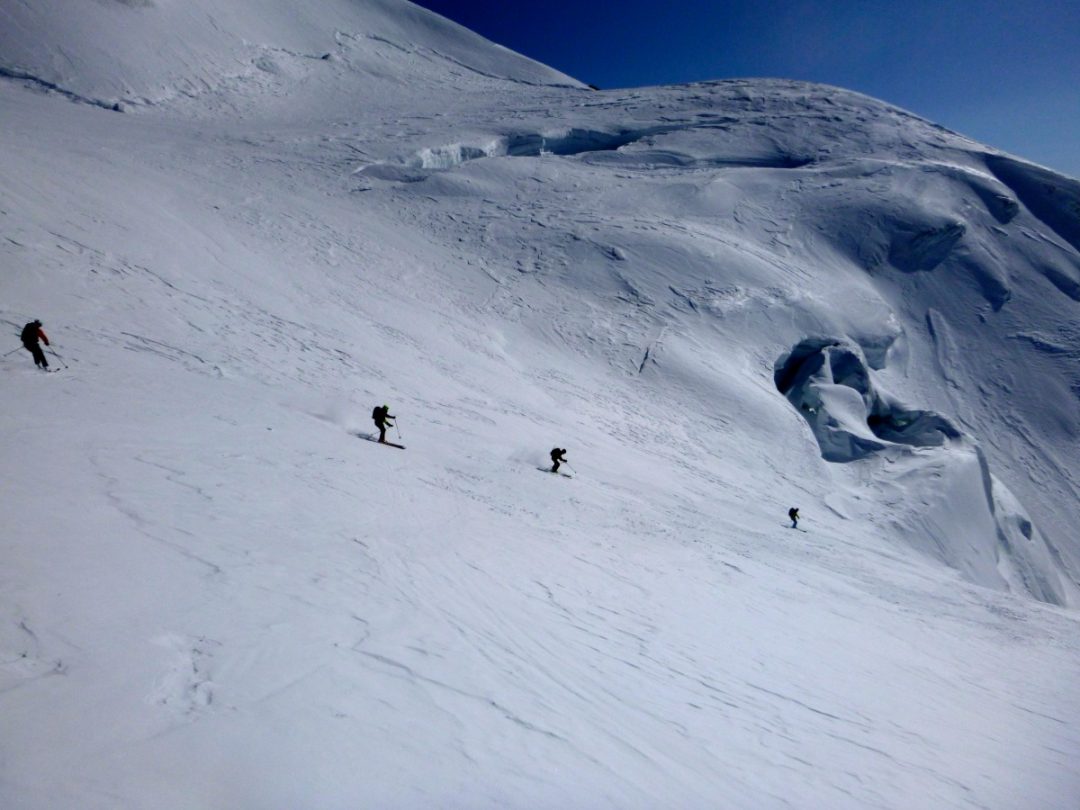 Even skiing something like the Watson Traverse on Washington’s Mt. Baker can frequently require a number of techniques to safely negotiate its complex (and often track-free) glaciers. Credit: Ian Nicholson