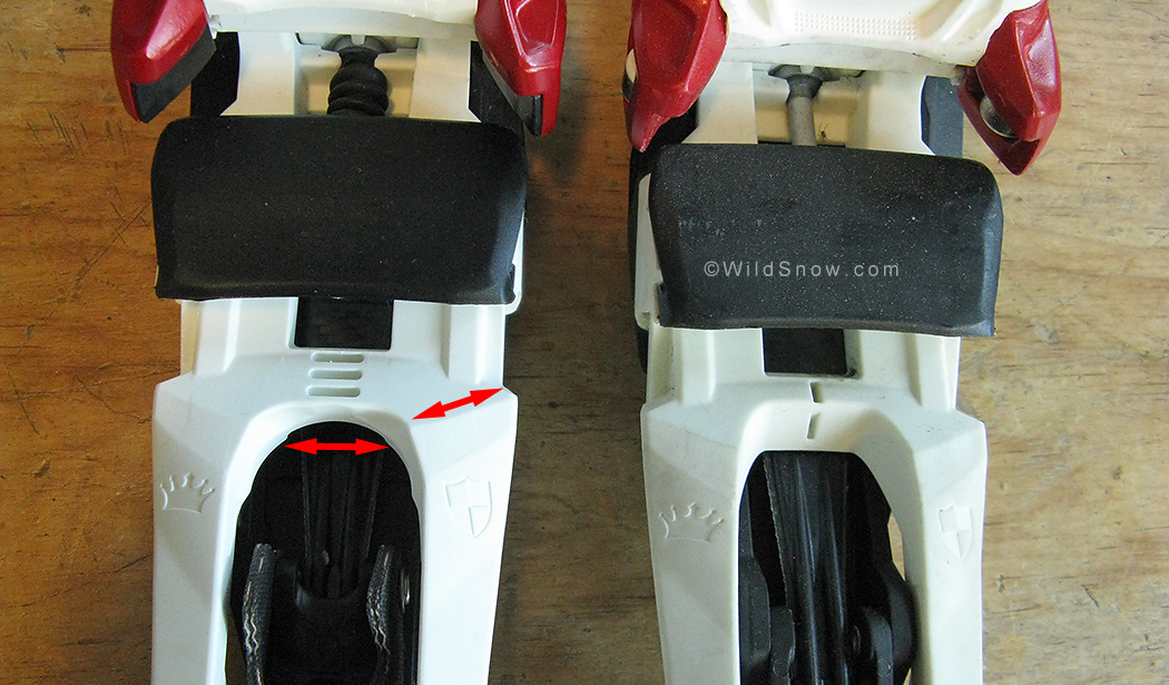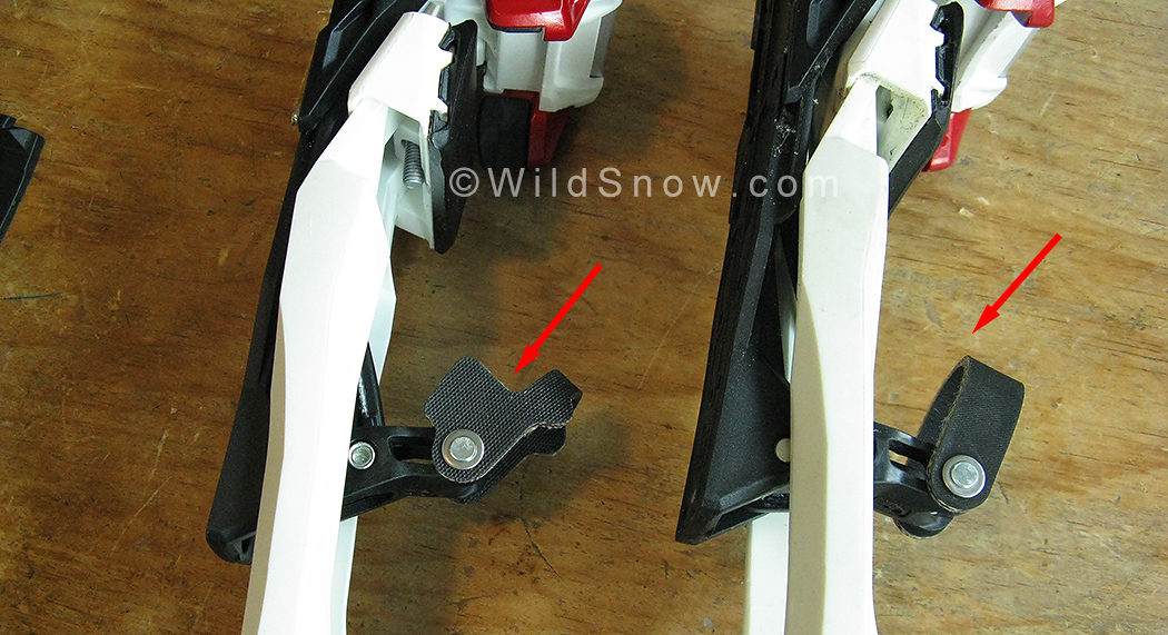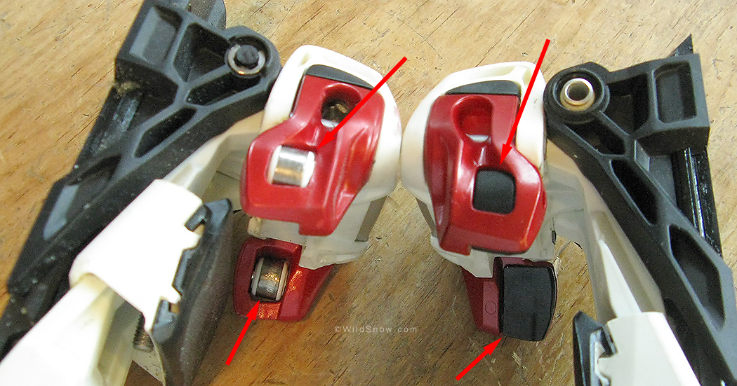Another big change, along the lines of making this more of a touring binding. Older version (left) had anti-friction rollers in the toe wings that tended to incur damage from AT boots with tech fittings. New version has hard plastic insert in same area that is said to deal better with tech fittings riding against it.