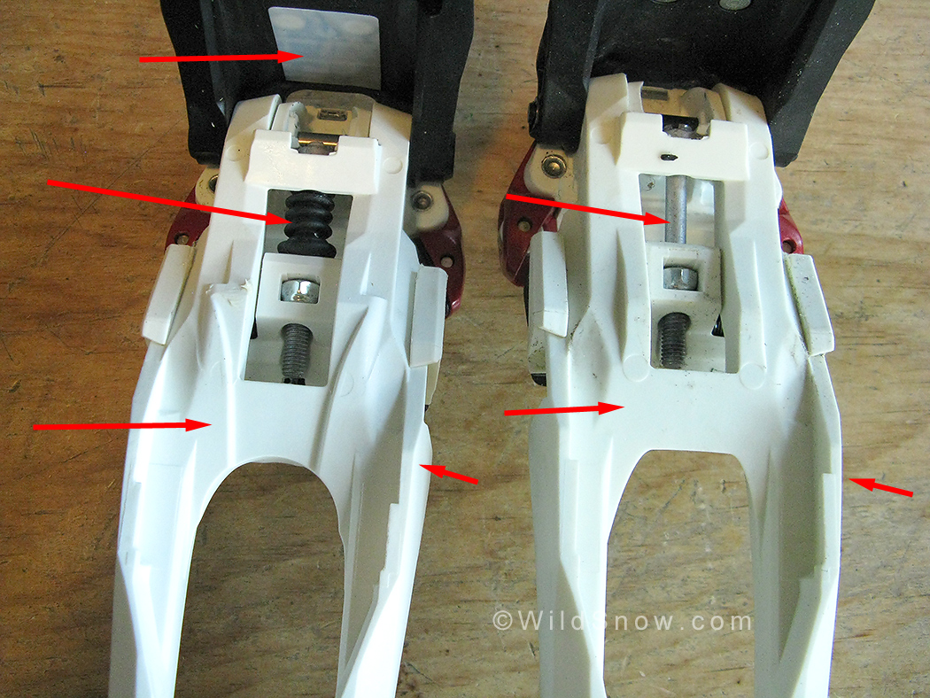 Marker Tour F 12/10 frame underside, 2011/2012 model to left. Upper left arrow points to anti-icing Teflon tape on new model. Left middle arrow points to anti-icing rubber boot on AFD height adjustment screw. One problem with the Marker design is it doesn't clear ice buildup well while being used in tour mode. Small improvements such as these probably make a huge difference. Much of the breakage reported with Marker touring bindings has been due to ice buildup causing extreme leverage on binding parts, so these anti-icing changes should result in better durability. Even so, if you use this type of binding for touring, spray with silicone before each trip, and clear any ice buildup before it causes problems. Lower arrows point to changes in shape of binding frame. The frame shape is stronger, and also sits flat on ski in touring mode without being slightly bent when weighted, as the older model did.