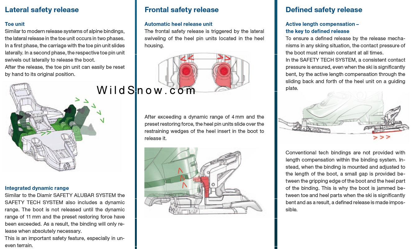 Conventional tech bindings are not provided with length compensation within the binding system (Ed. this seeems to be the thing they’re making a big deal out of, and it’s true the normal tech bindings don’t do well with length compensation as the ski flexes). Instead, when the binding is mounted and adjusted to the length of the boot, a small gap is provided between the gripping edge of the boot and the heel part of the binding. This is why the boot is jammed between toe and heel parts when the ski is significantly bent and as a result, a defined release is made impossible.