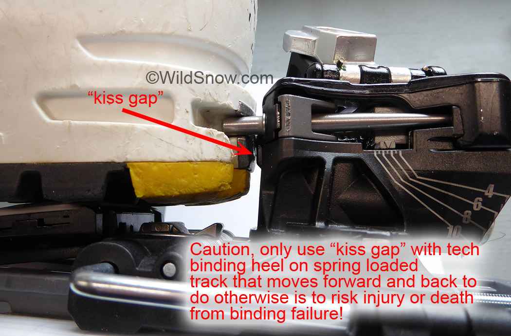 Later Dynafit bindings have a forward pressure system that allows the binding to be mounted with no ‘tech gap’ behind heel. IMPORTANT to identify which type of binding you have and set the gap accordingly.